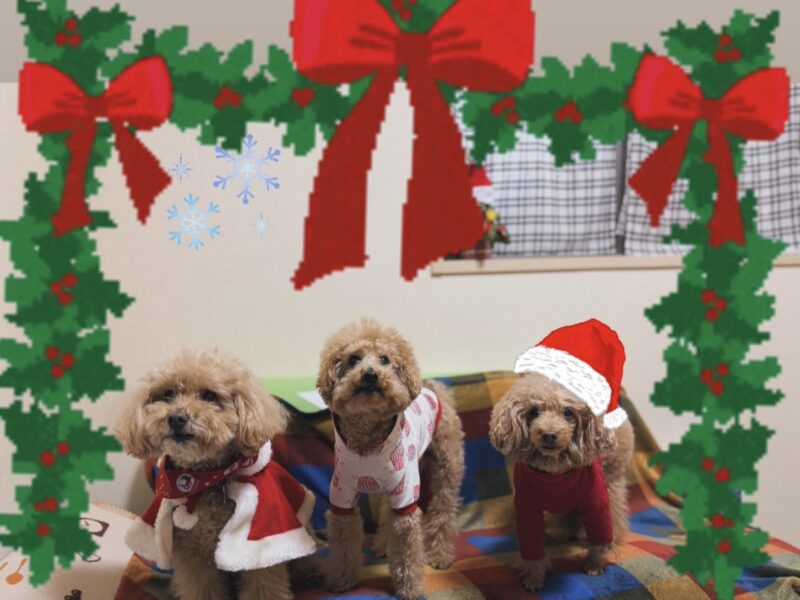 トイプー仲間で、毎年恒例のクリスマス会をしました🎄 今回もまんちゃんのおうちでワイワイと🧑‍🎄✨ 今回は、もり君が欠席で3わんでの参加🐶🐶🐶 左からマックちゃん、まんちゃん、ベティ  年齢が近く、みん …